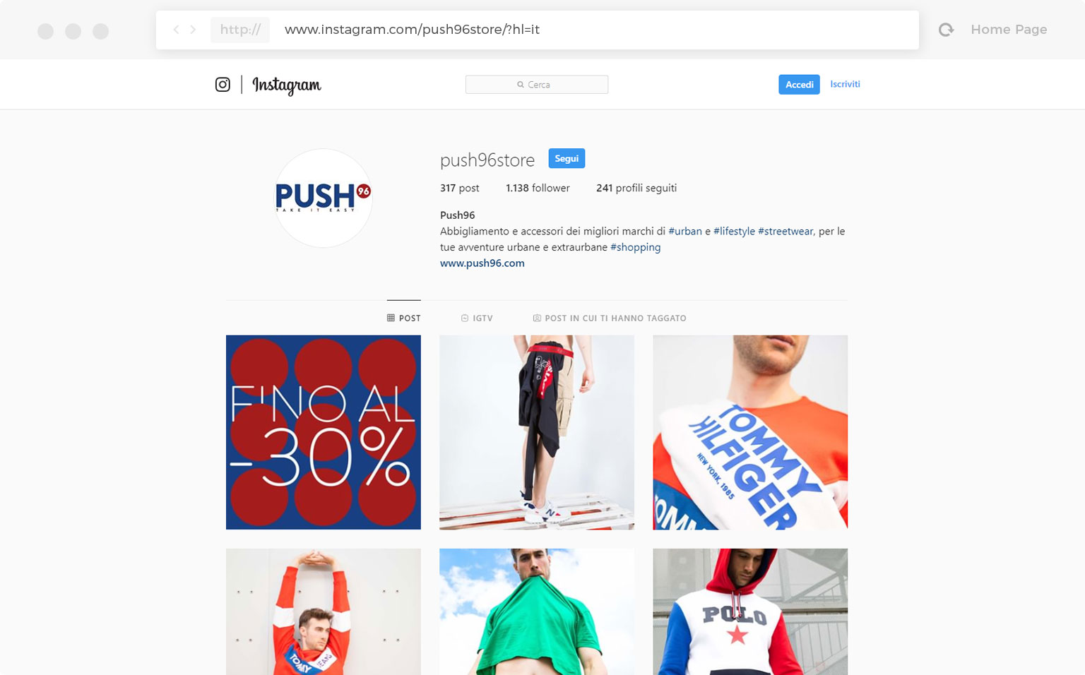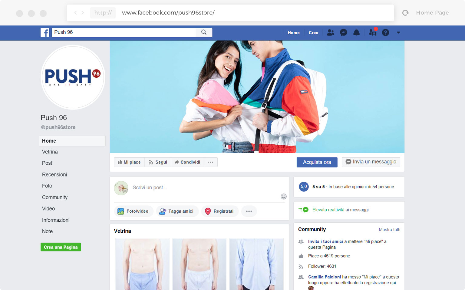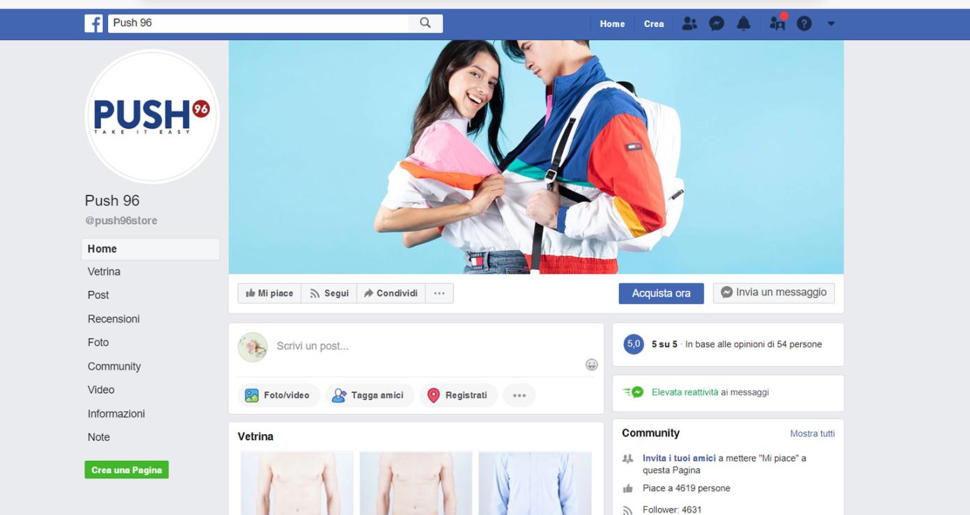 Per rivendere le grandi marche on-line, la presenza sui social è diventata necessaria. Lo sa bene Push96 che ha scelto i due social più noti per promuovere e vendere i suoi prodotti: Facebook e Instagram. Simbiosi ha scelto di studiare un piano editoriale ad hoc per ogni canale di comunicazione e di allargare la fanbase di Facebook per dare maggiore visibilità ai loro prodotti.